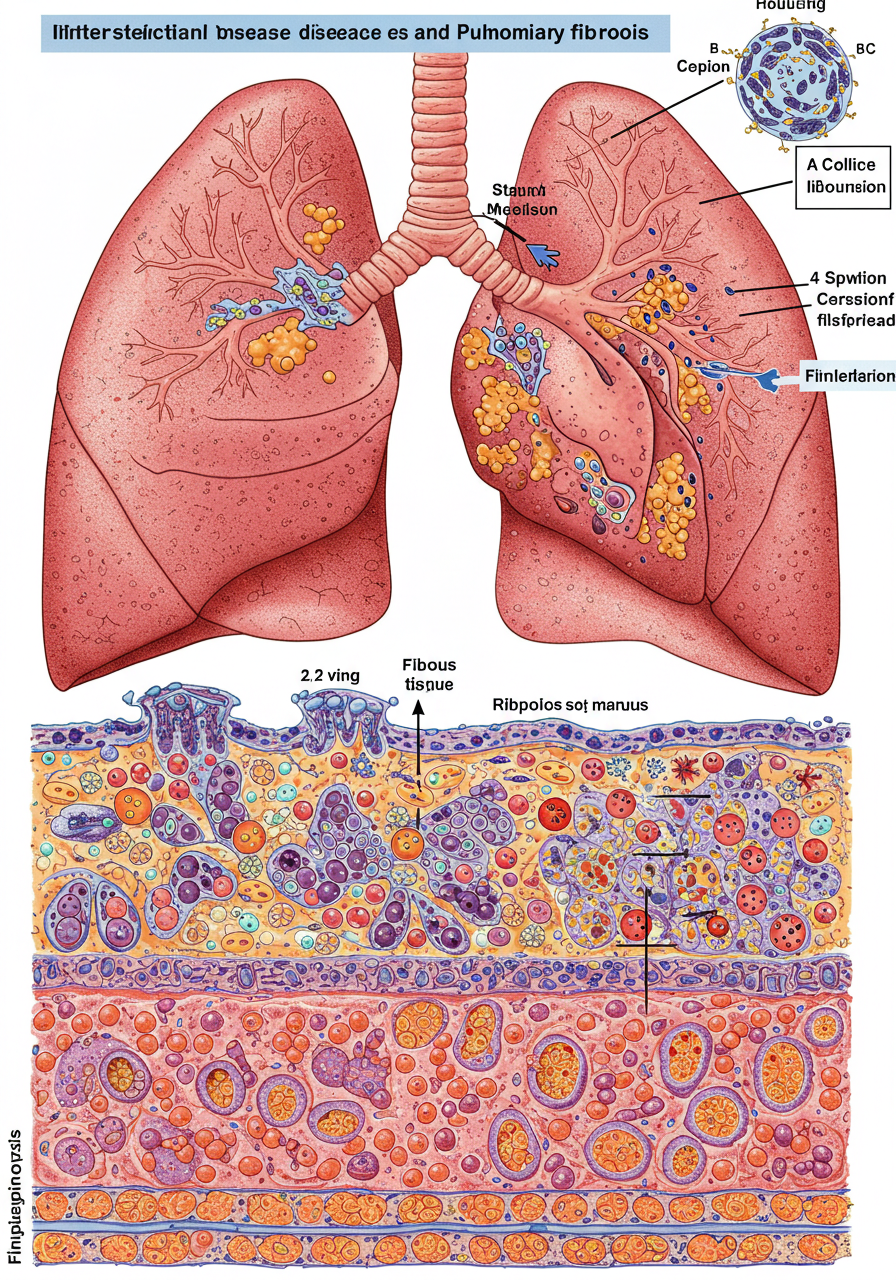 A1 진단은 고해상도 흉부 CT와 폐기능 검사가 기본입니다. CT를 통해 폐 조직의 섬유화 상태를 확인하며, 폐기능 검사는 폐 용량과 가스 교환 능력을 평가합니다. 필요 시 혈액 검사와 폐 조직 생검이 추가될 수 있습니다.