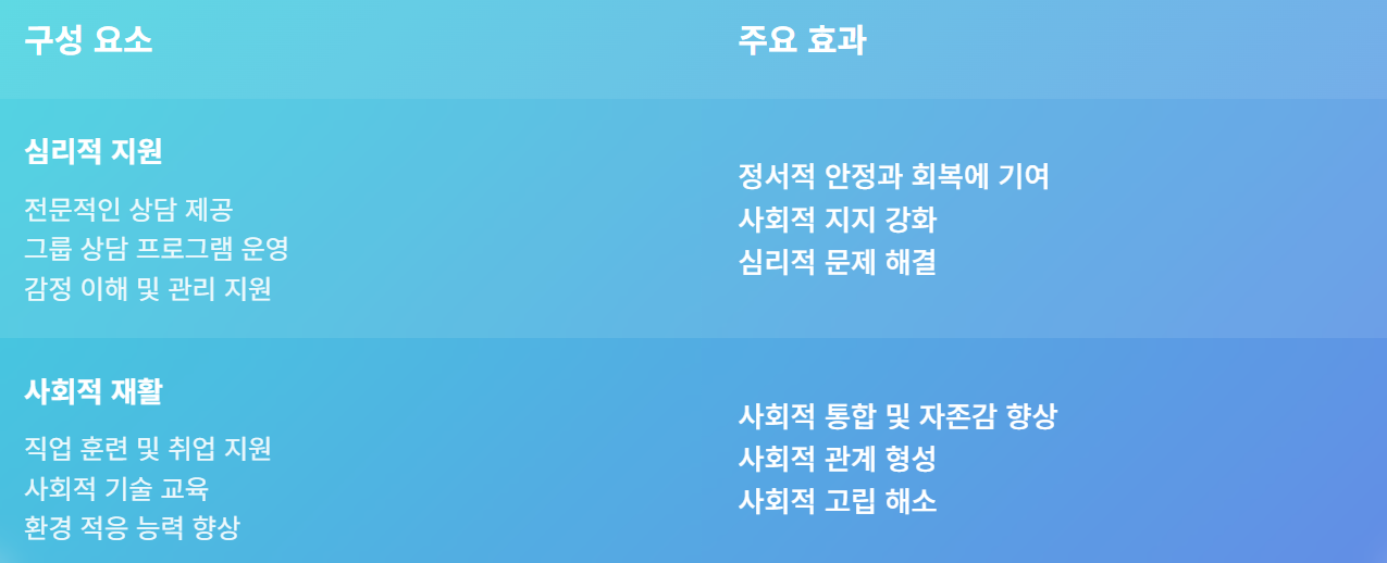 ✅이 프로그램은 심리적 지원과 사회적 재활을 포함합니다.