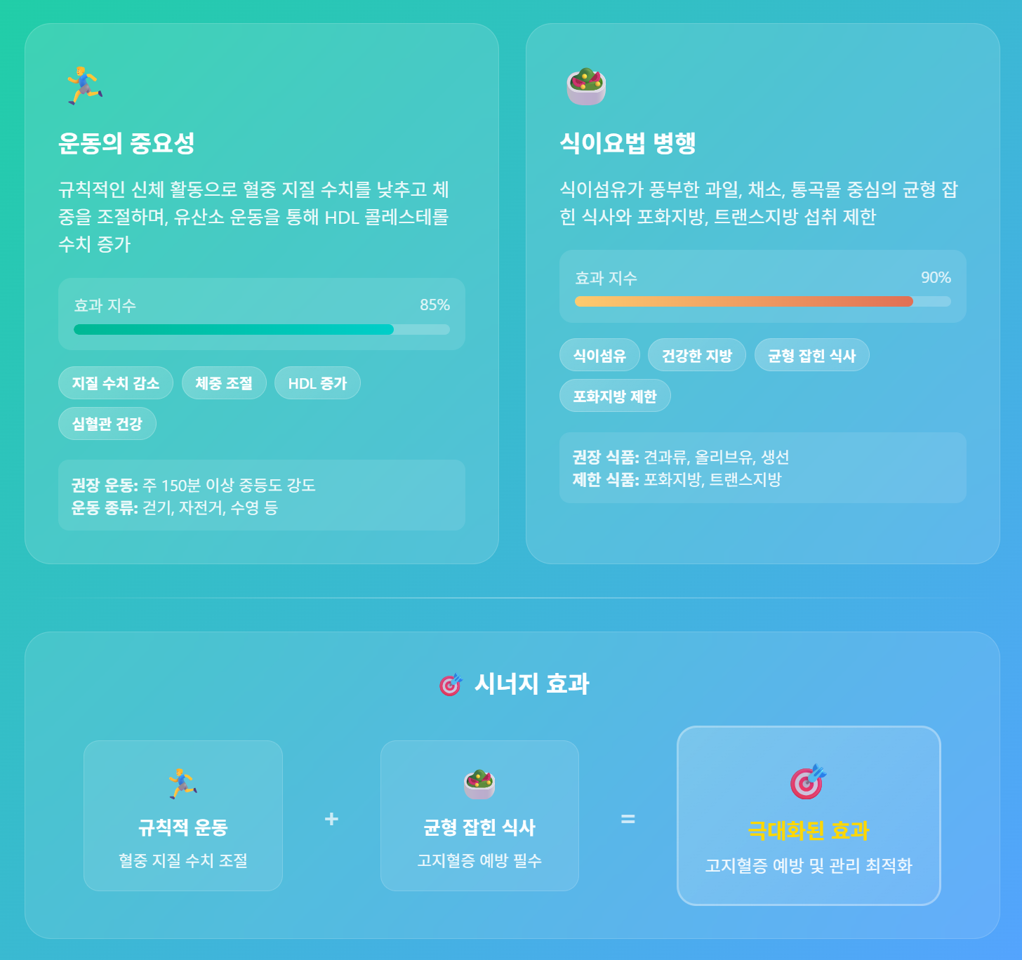특히 견과류, 올리브유, 그리고 생선과 같은 건강한 지방을 포함하는 것이 도움이 됩니다. 이러한 식이요법과 운동을 병행함으로써 고지혈증 예방 효과를 극대화할 수 있습니다.