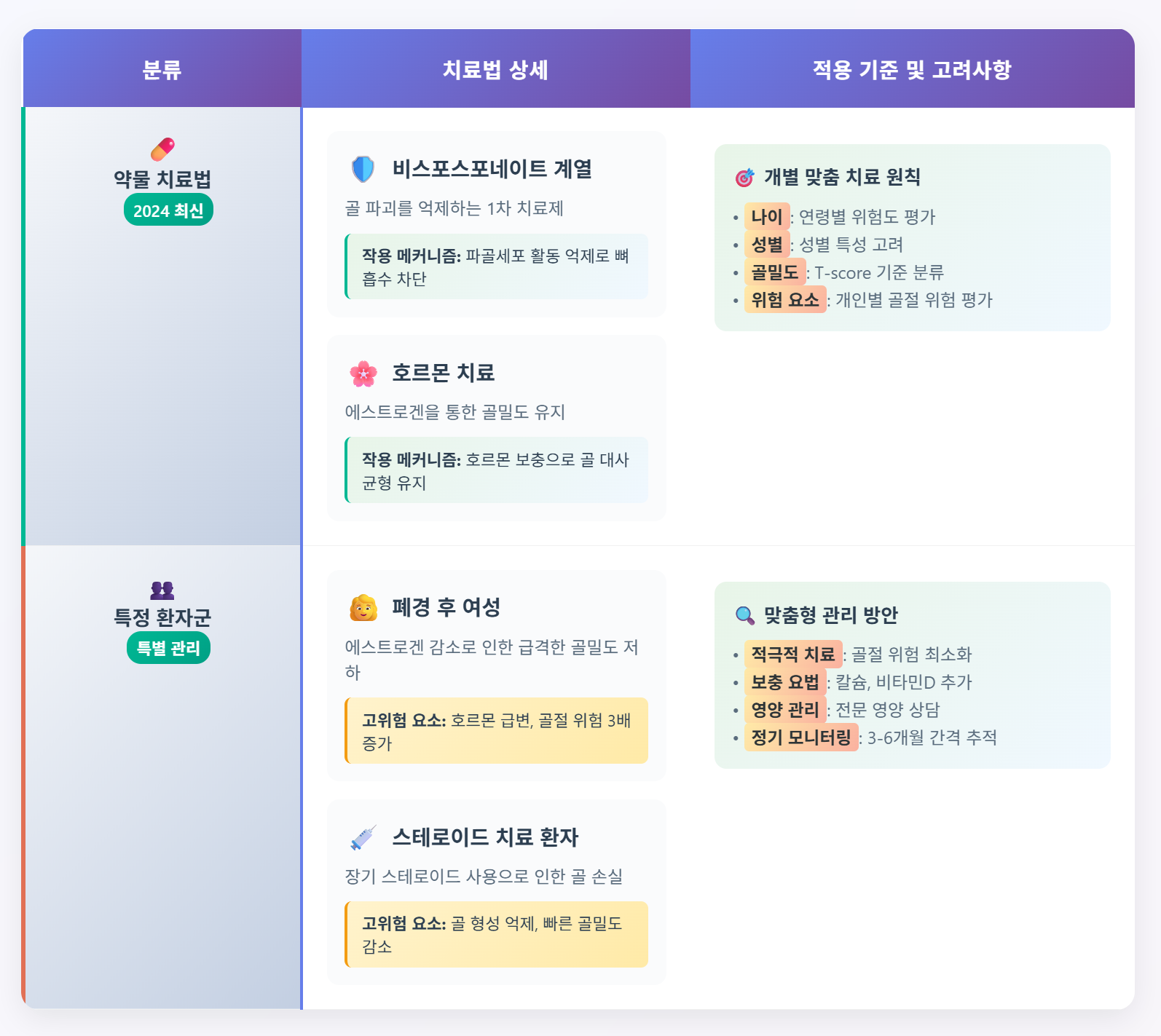 | 주요 내용 | 골다공증 약물 치료는 비스포스포네이트와 호르몬 치료로 분류되며, 환자군에 따라 다르게 접근해야 합니다. |
