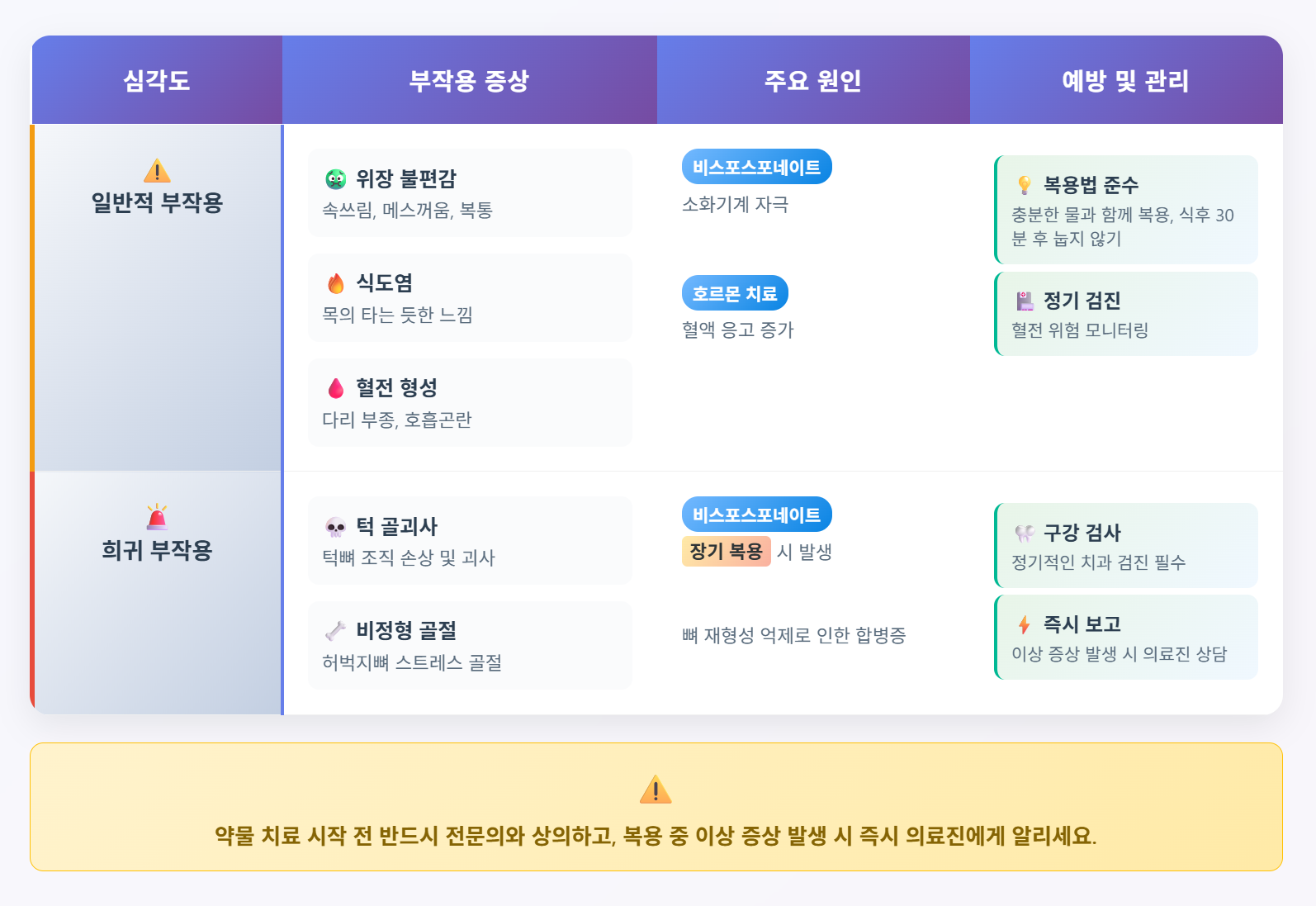✅부작용으로는 소화기계 문제와 턱 골괴사 등이 있습니다.