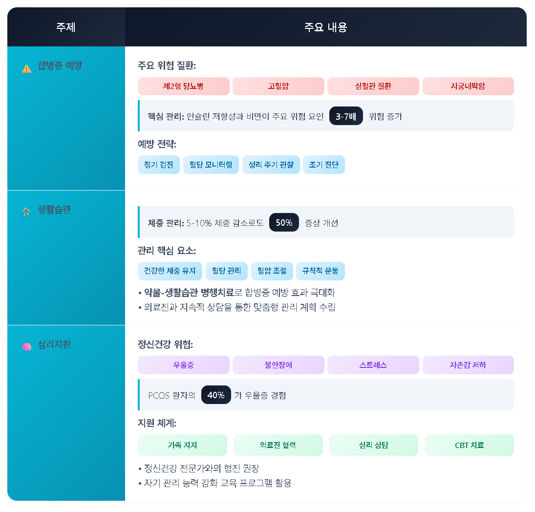 PCOS는 장기적으로 제2형 당뇨병, 고혈압, 심혈관 질환 위험을 증가시킵니다.