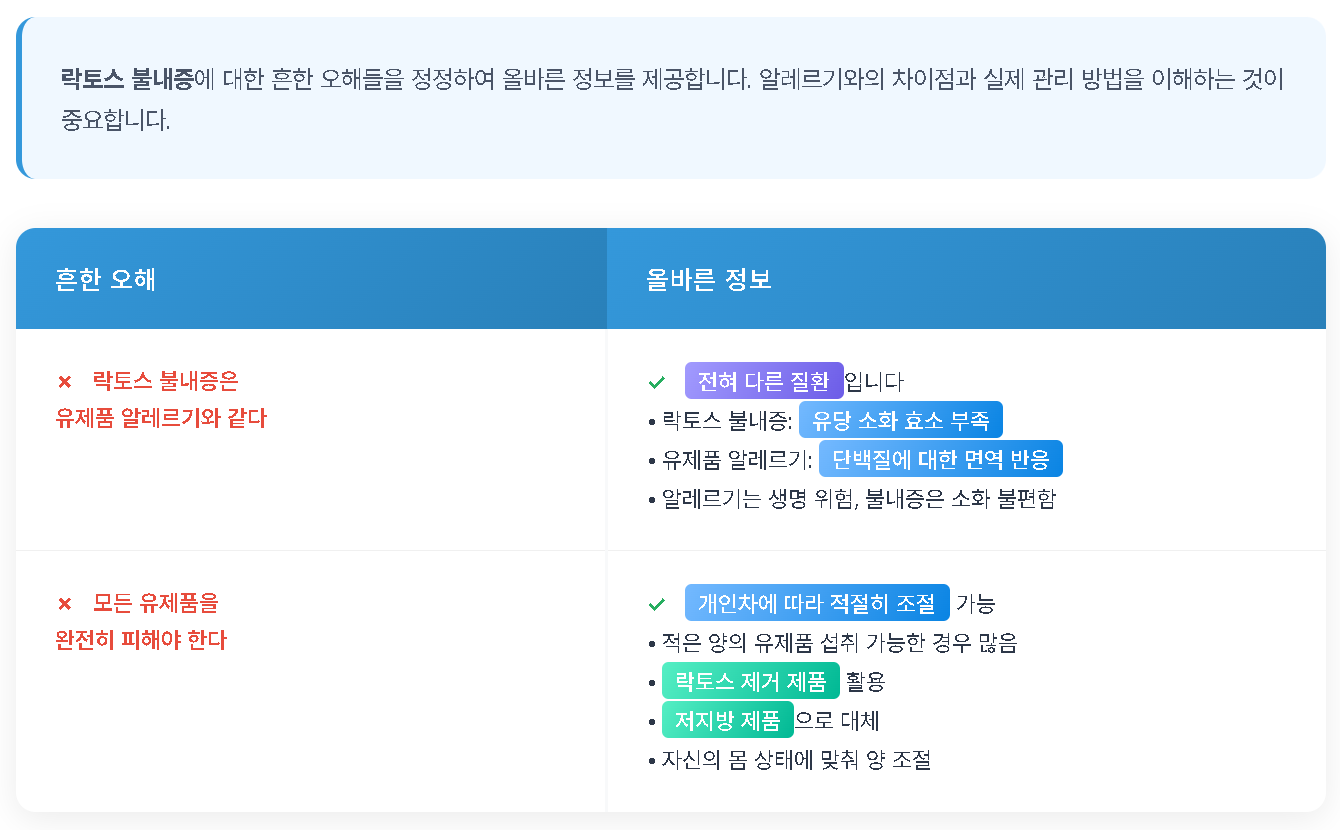많은 사람들이 락토스 불내증과 유제품 알레르기를 혼동하는 경우가 있습니다. 락토스 불내증은 유당 소화 효소 부족으로 발생하는 반면, 유제품 알레르기는 면역 반응으로 인해 발생합니다. 두 상태는 원인과 증상이 다르므로 혼동하지 않는 것이 중요합니다.