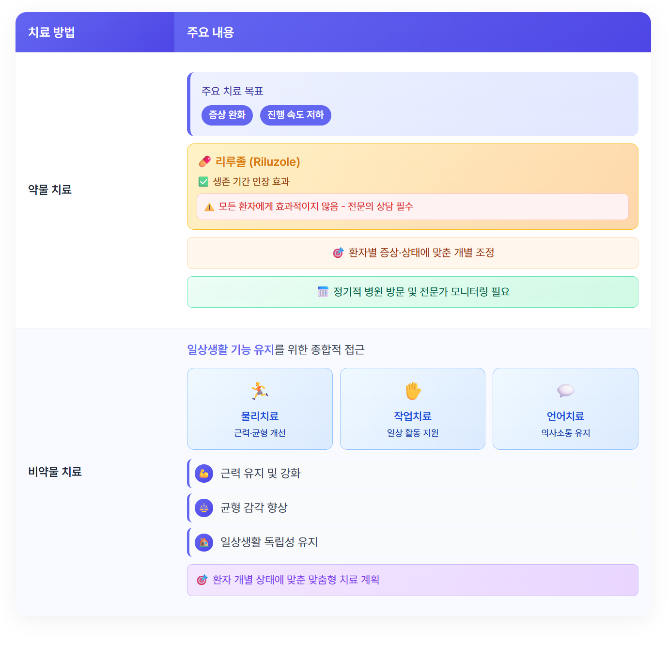 루게릭병의 치료에는 주로 증상 완화와 진행 속도 저하를 목표로 하는 약물 치료가 포함됩니다. 대표적인 약물로는 리루졸(Riluzole)이 있으며, 이는 생존 기간을 연장하는 효과가 있습니다. 그러나 이 약물은 모든 환자에게 효과적인 것은 아니므로, 전문의의 상담이 필요합니다.