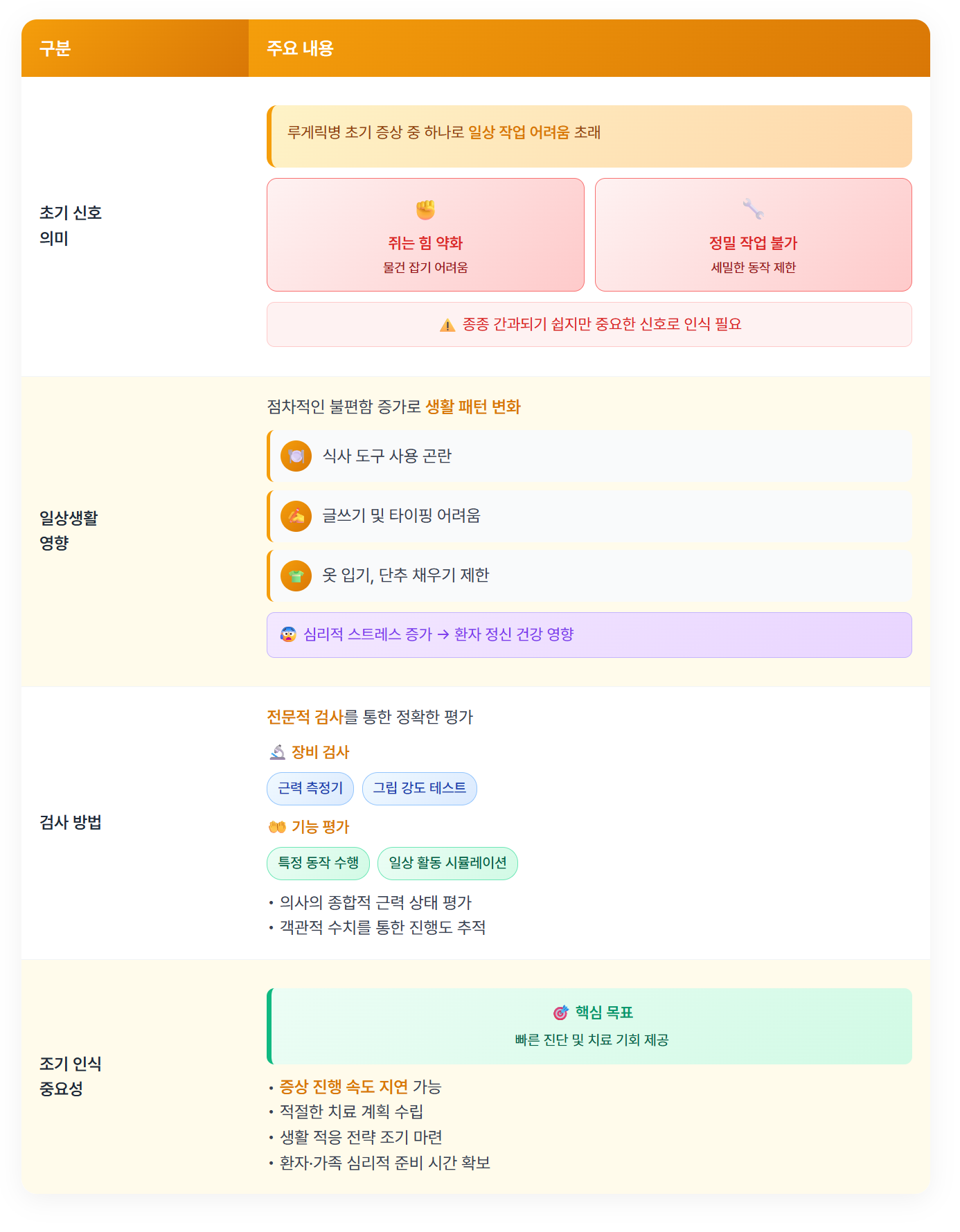 루게릭병의 초기 증상 중 하나인 손가락 근력 저하는 일상적인 작업에 어려움을 초래할 수 있습니다. 예를 들어, 물건을 쥐는 힘이 약해지거나, 정밀한 작업에 필요한 힘이 부족해지는 경우가 발생할 수 있습니다. 이러한 변화는 종종 간과되기 쉽지만, 중요한 신호로 인식되어야 합니다.