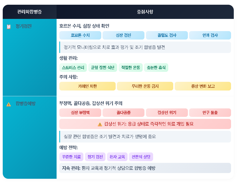 심장 부정맥, 골다공증, 갑상선 위기(갑상선 혼수) 등이 주요 합병증입니다.