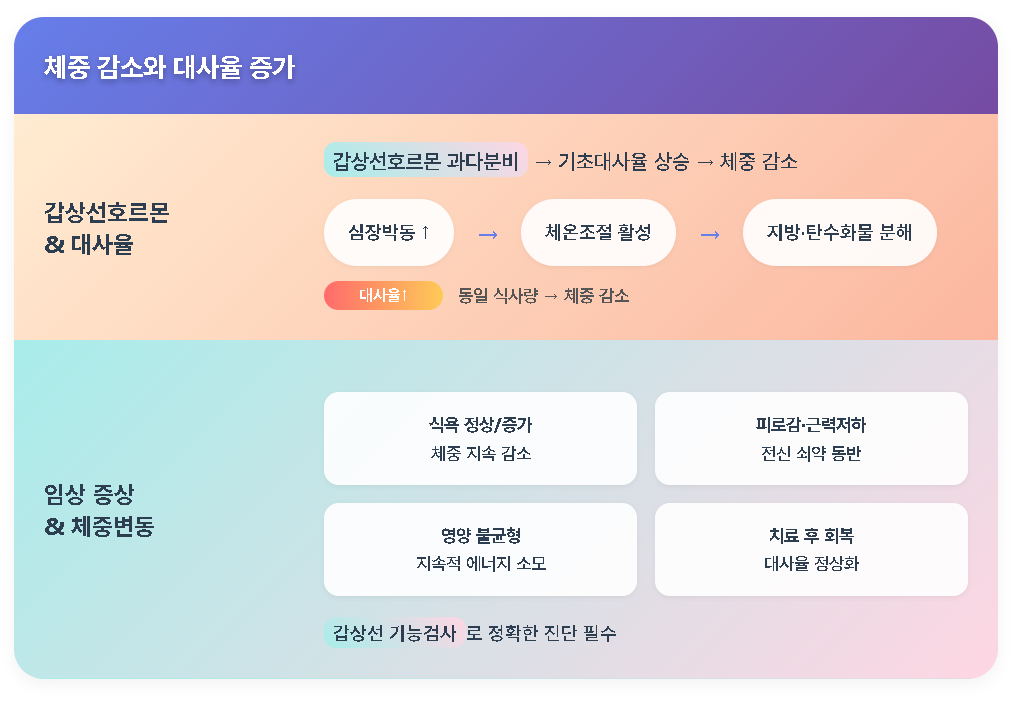대사 증가로 인한 피로감과 근력 저하도 흔히 동반됩니다.