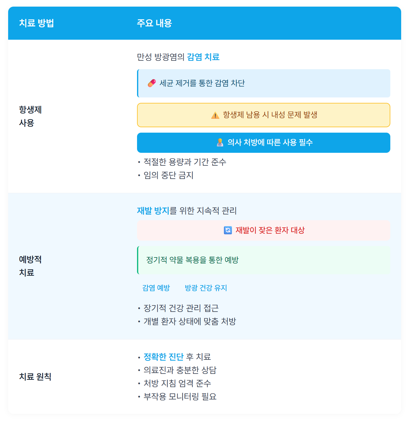 A4: 치료 방법으로는 항생제 사용, 생활 습관 개선, 예방적 약물 치료 등이 있습니다.
