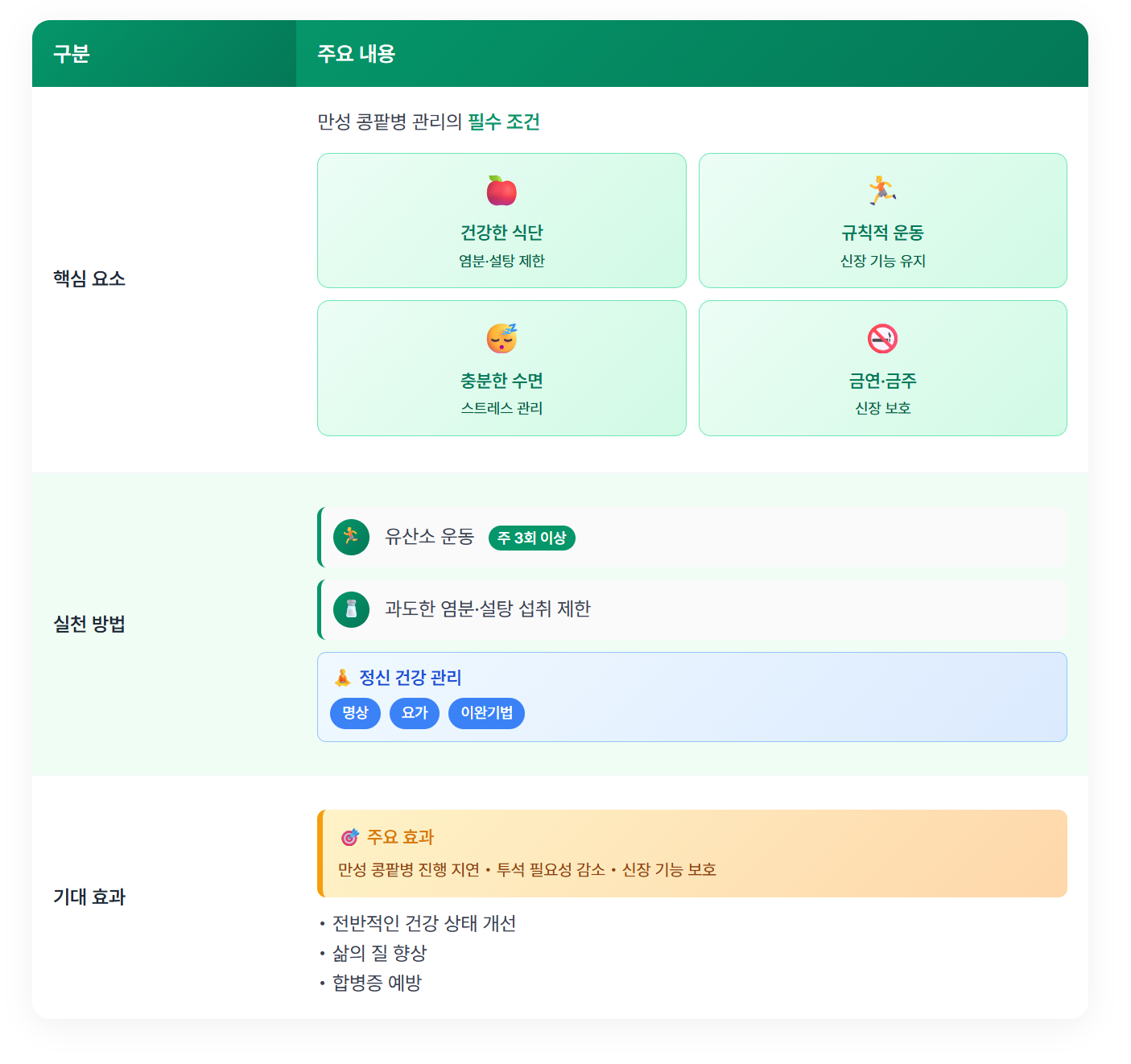 | 기본 원칙 | 단백질 조절, 나트륨과 칼륨 제한 |