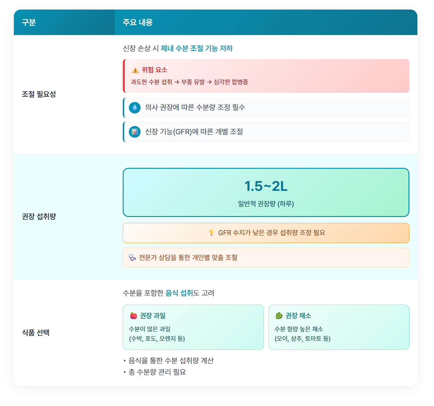 | 중요성 | 신장 기능 유지 |