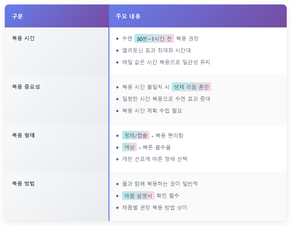 이러한 복용 시간에 대한 이해는 멜라토닌의 효과를 극대화하는 데 중요한 요소입니다. 따라서 복용 시간에 대한 계획이 필요합니다.