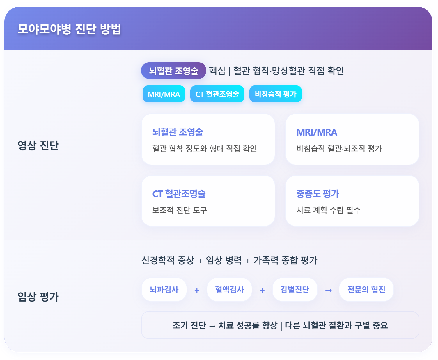 종합적인 평가를 통해 모야모야병 여부를 판단하며, 다른 뇌혈관 질환과의 구별이 중요합니다.