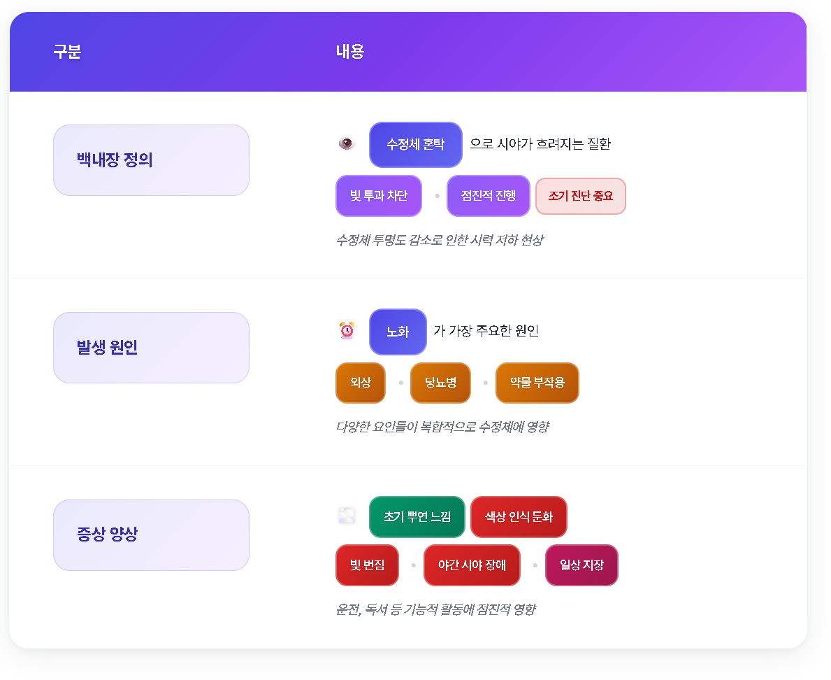 백내장은 눈 속 수정체가 혼탁해지는 현상으로, 주로 노화가 가장 큰 원인으로 작용합니다.