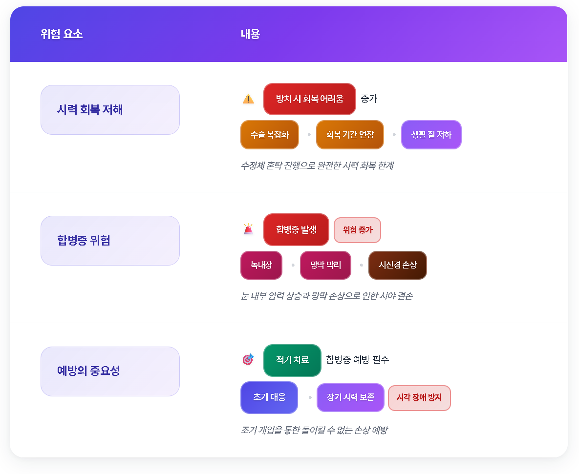 방치된 백내장은 녹내장, 망막 박리 등 합병증 발생 위험을 높입니다.
