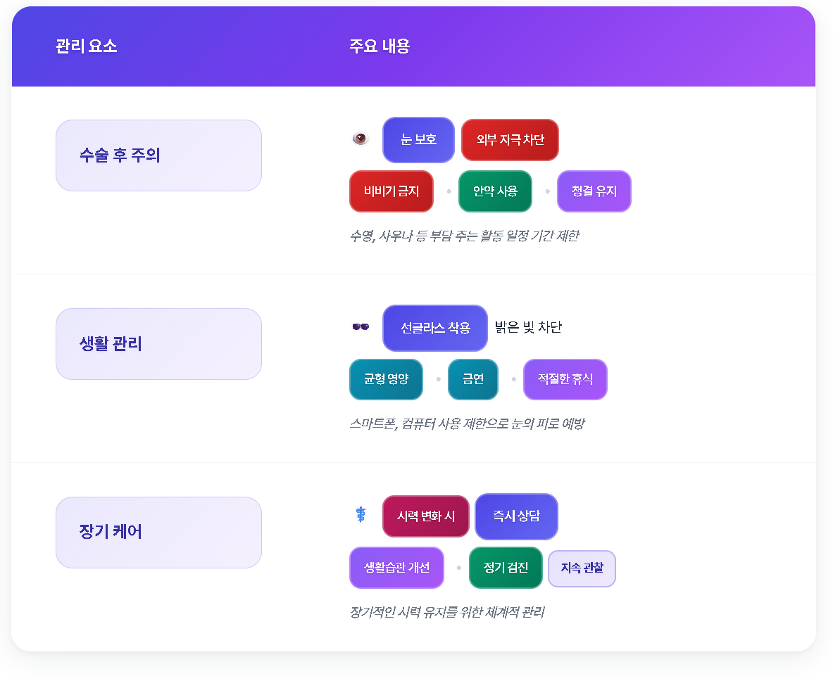 | 회복 기간 동안 눈 관리와 정기 검진이 필요하다 |