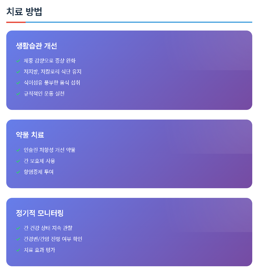 비알코올성 지방간염의 치료는 주로 생활습관 개선에 초점이 맞춰져 있습니다. 체중 감소, 규칙적인 운동, 건강한 식사를 통해 간의 지방을 감소시킬 수 있습니다. 약물 치료는 특정 경우에 사용될 수 있으며, 의사의 처방에 따라 진행됩니다.