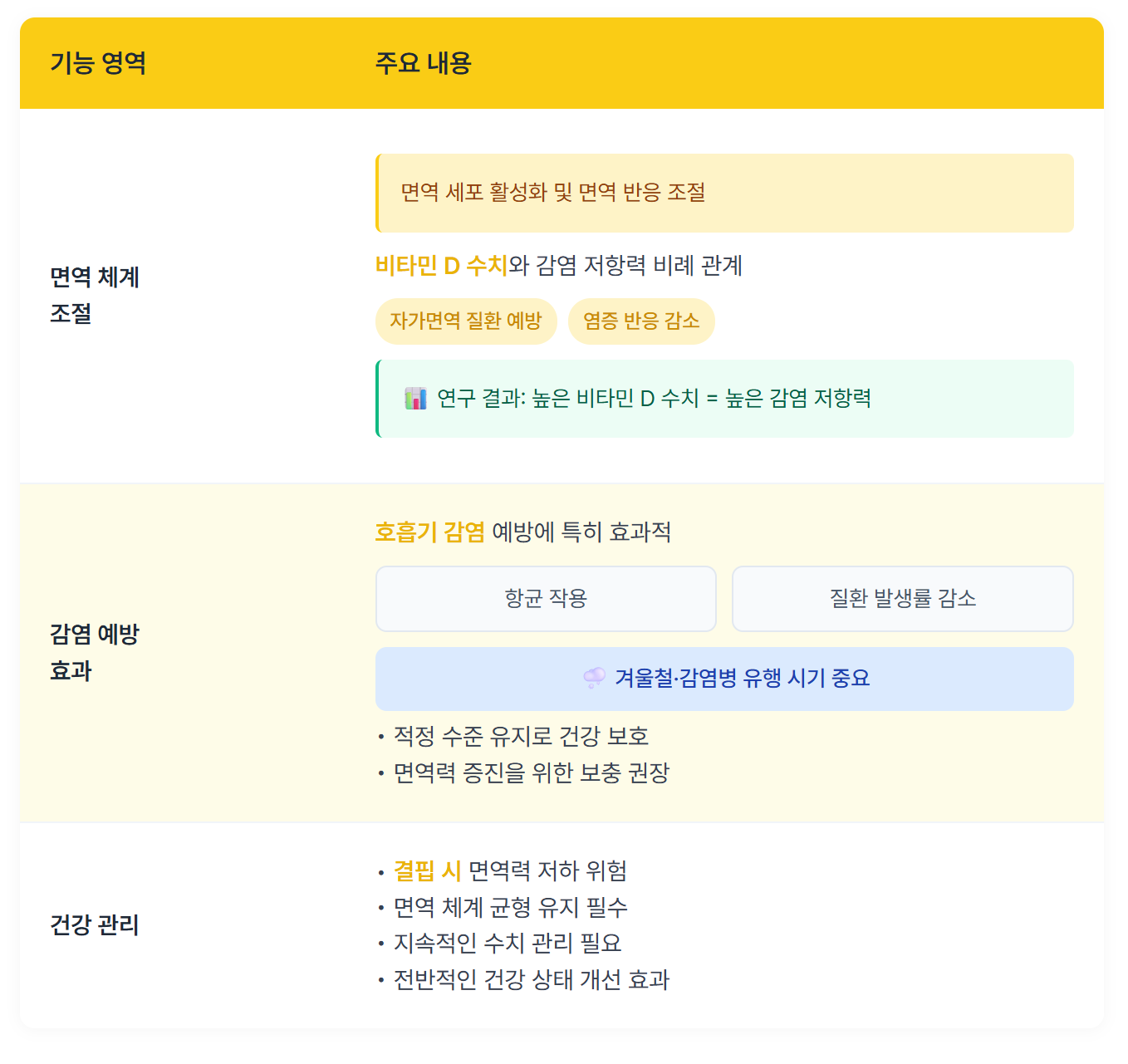 따라서, 겨울철이나 감염병이 유행하는 시기에 비타민 D 수치를 적정 수준으로 유지하는 것이 중요합니다. 면역력을 높이는 방법으로 비타민 D 보충이 효과적일 수 있으며, 이를 통해 건강을 유지할 수 있습니다.