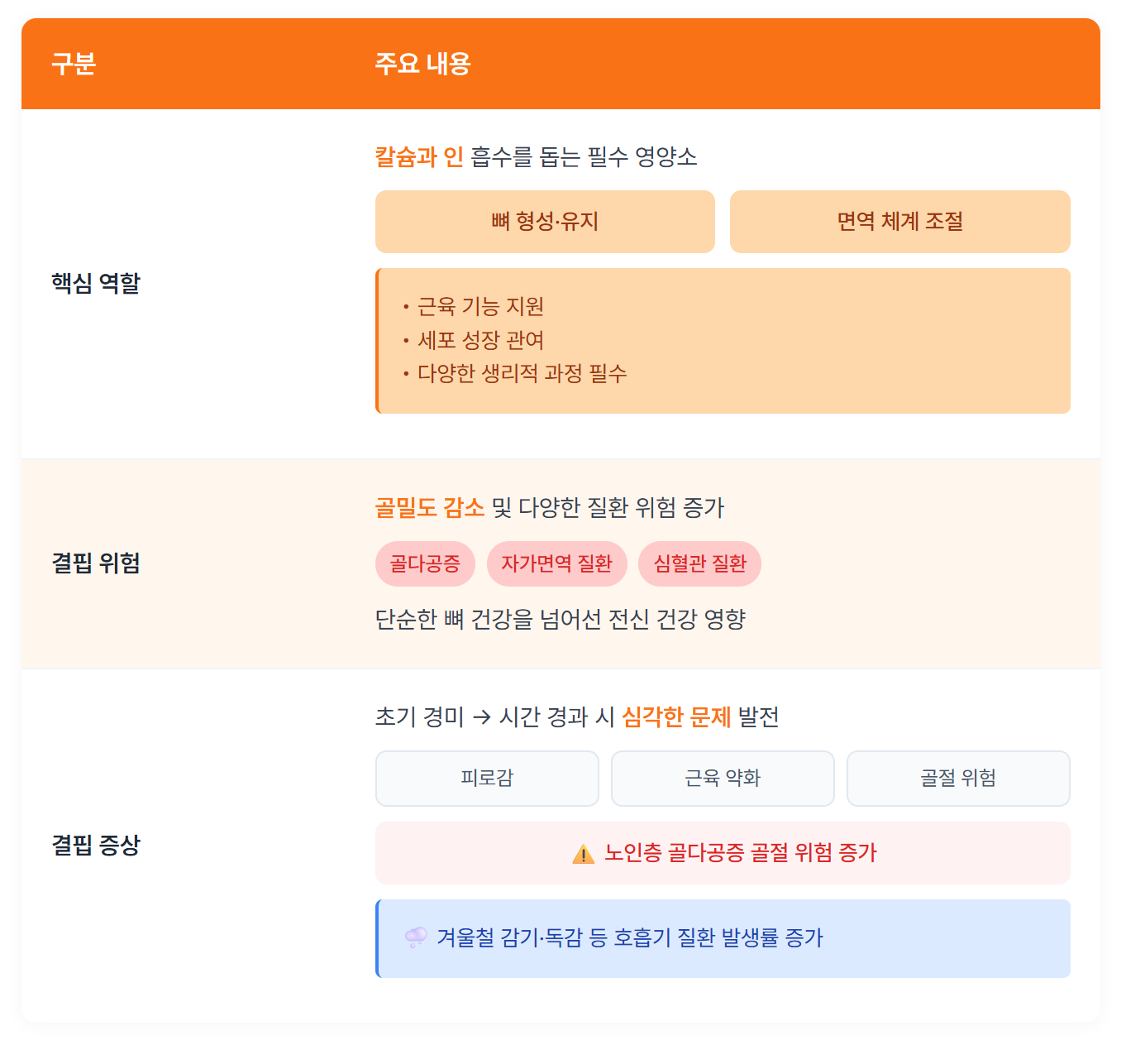✅결핍 증상은 골다공증, 면역력 저하 등을 포함합니다
