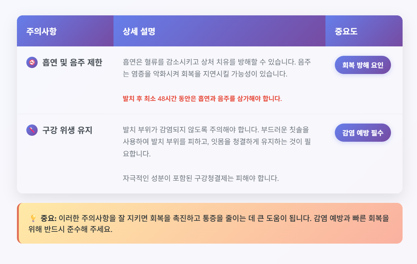사랑니 발치 후에는 흡연과 음주를 피하는 것이 좋습니다. 흡연은 혈류를 감소시키고, 상처 치유를 방해할 수 있습니다. 또한, 음주는 염증을 악화시킬 수 있으므로 회복을 지연시킬 가능성이 있습니다.