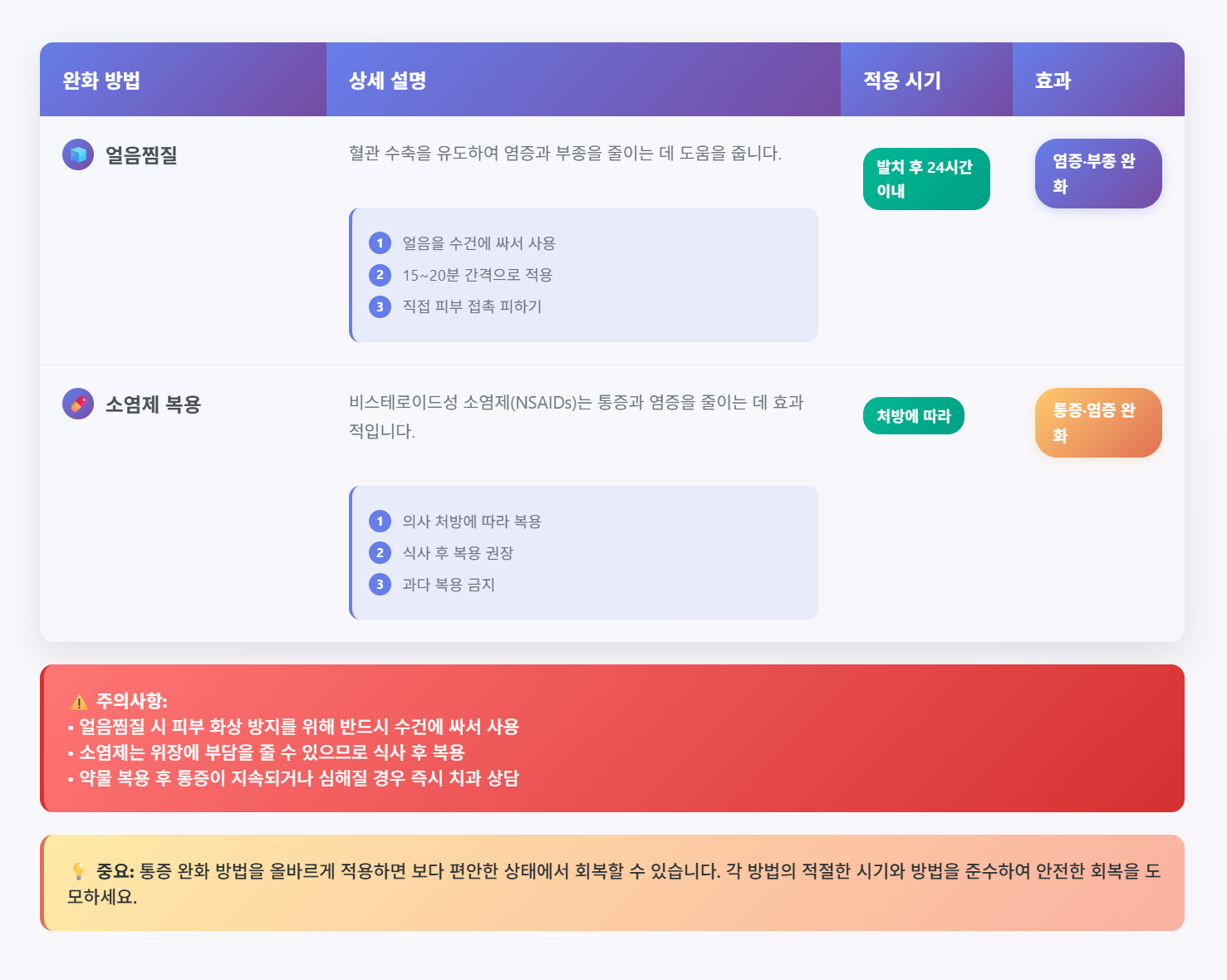 | 얼음찜질 | 혈관 수축 및 염증 감소 |