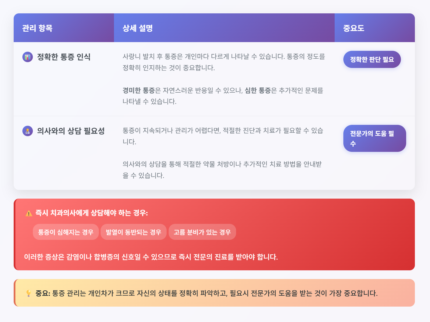 통증이 심해지거나 발열, 고름 분비 등이 동반될 경우, 즉시 치과의사에게 상담해야 합니다. 이러한 증상은 감염이나 합병증의 신호일 수 있습니다.