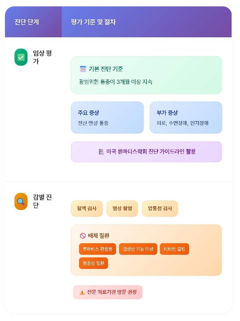 진단 기준에는 미국 류마티스학회의 섬유근육통 진단 가이드라인이 활용됩니다.