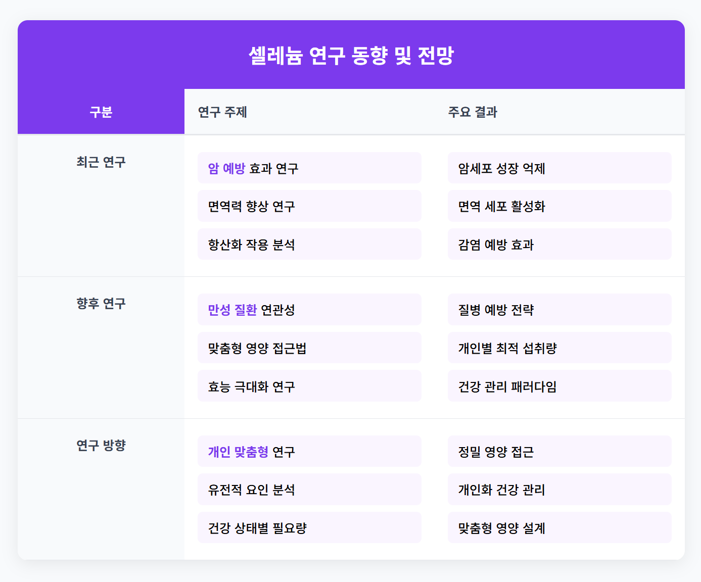 최근 셀레늄과 관련된 연구가 활발히 진행되고 있습니다. 일부 연구에서는 셀레늄이 암 예방에 미치는 영향을 분석하고 있습니다. 셀레늄이 항산화 작용을 통해 암세포의 성장을 억제할 수 있다는 결과가 보고되고 있으며, 이는 향후 암 예방 전략에서 중요한 역할을 할 수 있습니다.