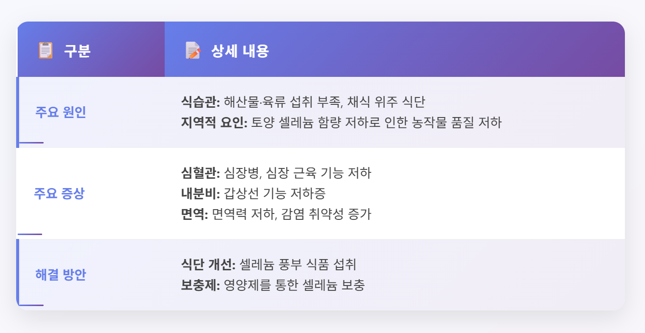 A2: 셀레늄 결핍은 심장병, 갑상선 기능 저하, 면역력 저하 등의 증상을 유발할 수 있습니다.