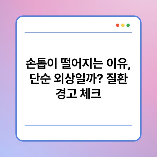 손톱이 갑자기 떨어지는 현상은 단순한 외상일 수도 있지만, 때로는 신체 내부의 건강 문제를 경고하는 신호일 수 있습니다. 손톱이 떨어지는 이유를 정확히 파악하는 것은 적절한 대응과 치료를 위해 중요합니다. 본문에서는 손톱 탈락의 다양한 원인과 함께 주의해야 할 질환 증상, 그리고 예방 및 관리 방법에 대해 자세히 알아보겠습니다. 손톱 건강에 관심이 있는 분들에게 유익한 정보가 될 것입니다. 지금부터 손톱이 떨어지는 이유와 관련된 주요 정보들을 하나씩 살펴보겠습니다.