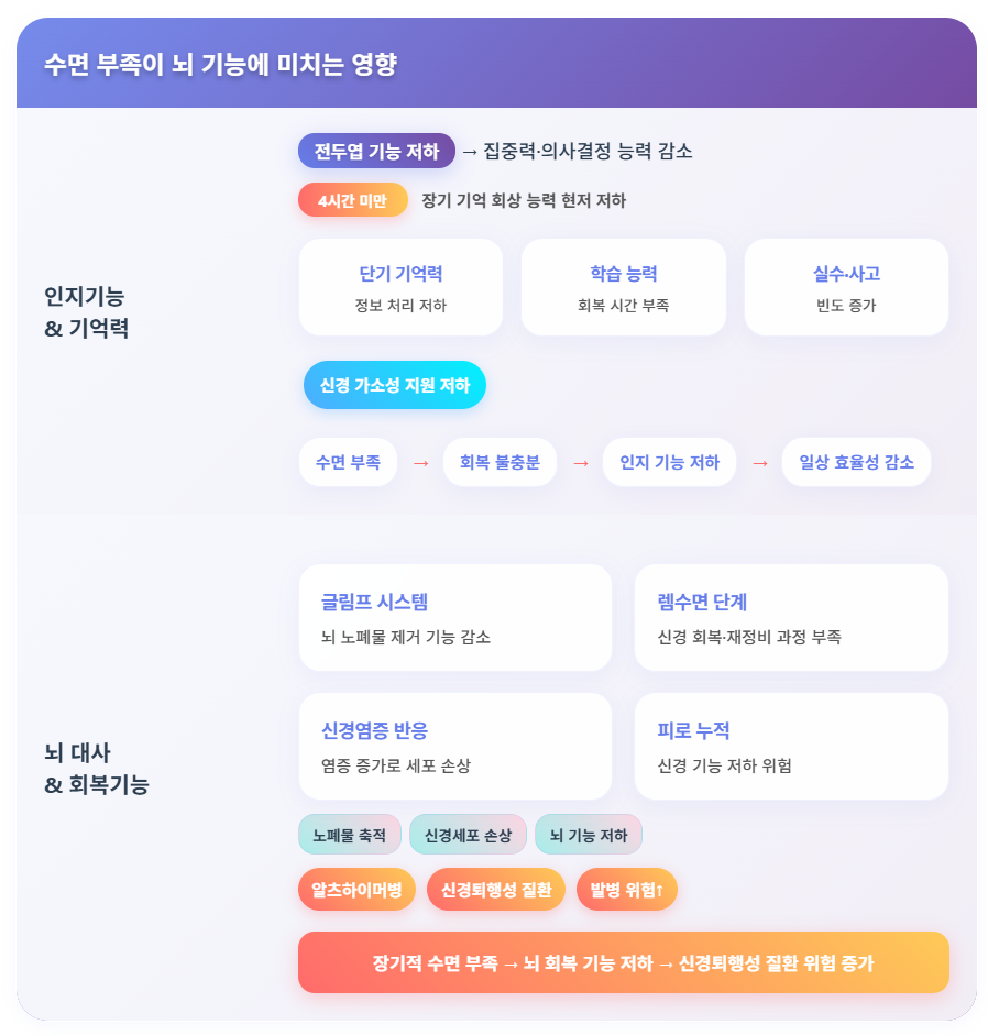 장기적으로 인지 기능 저하와 신경퇴행성 질환 위험이 증가할 수 있어 권장 수면 시간을 지키는 것이 중요합니다.