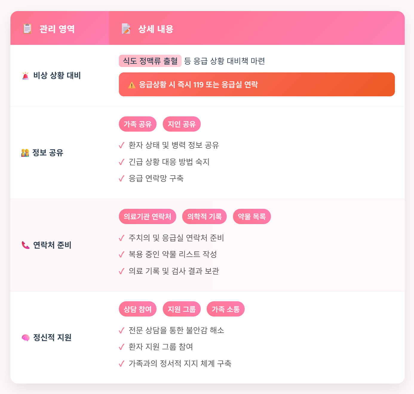 간경변 환자는 식도 정맥류 출혈과 같은 비상 상황에 대비해야 합니다. 이를 위해 환자는 자신의 상태와 관련된 정보를 충분히 숙지해야 합니다. 가족이나 지인에게 이러한 정보를 공유하고, 긴급 상황에서 연락할 수 있는 방법을 마련하는 것이 중요합니다.