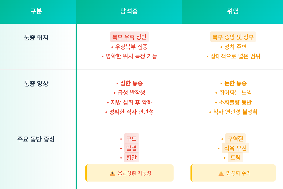 | 통증 위치 | 담석증: 복부 우측 상단 / 위염: 복부 중앙 |
