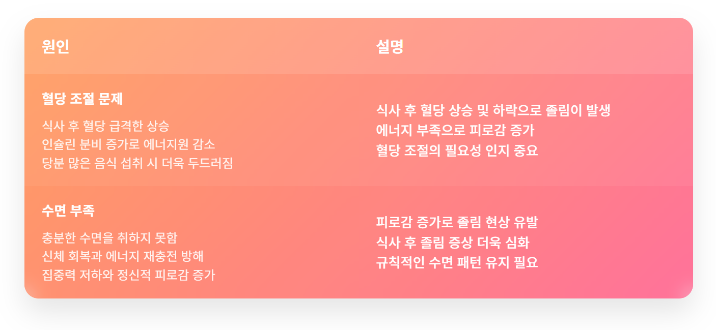 | 혈당 조절 문제 | 식사 후 혈당 상승 및 하락으로 졸림이 발생 |