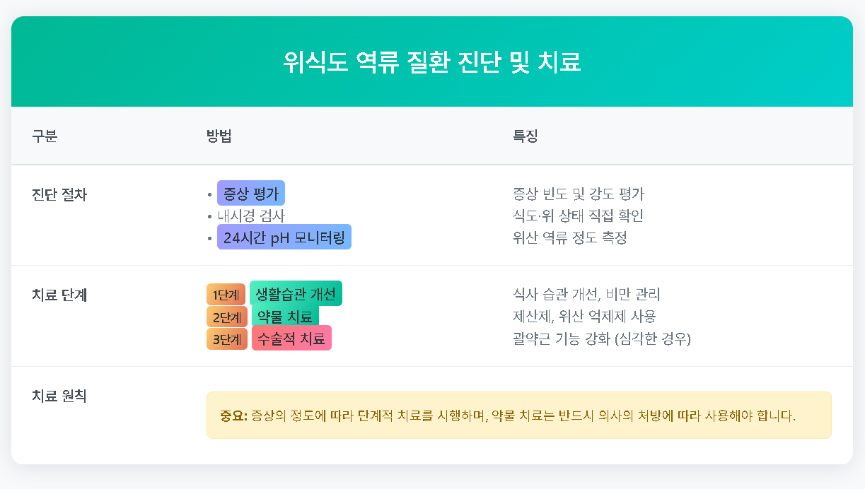 | 증상 평가, 내시경 검사, pH 모니터링 | 생활습관 개선, 약물 치료, 수술적 치료 |