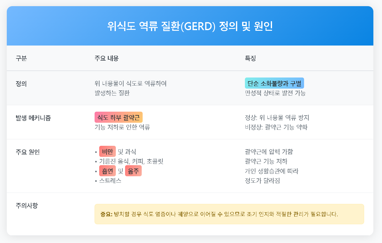 위식도 역류 질환(GERD)은 위의 내용물이 식도로 역류하여 발생하는 질환입니다. 이는 식도 하부 괄약근의 기능 저하로 인해 발생할 수 있습니다. 정상적인 경우에는 괄약근이 위 내용물이 식도로 올라오는 것을 방지하지만, 이 기능이 약해지면 역류가 발생하게 됩니다.