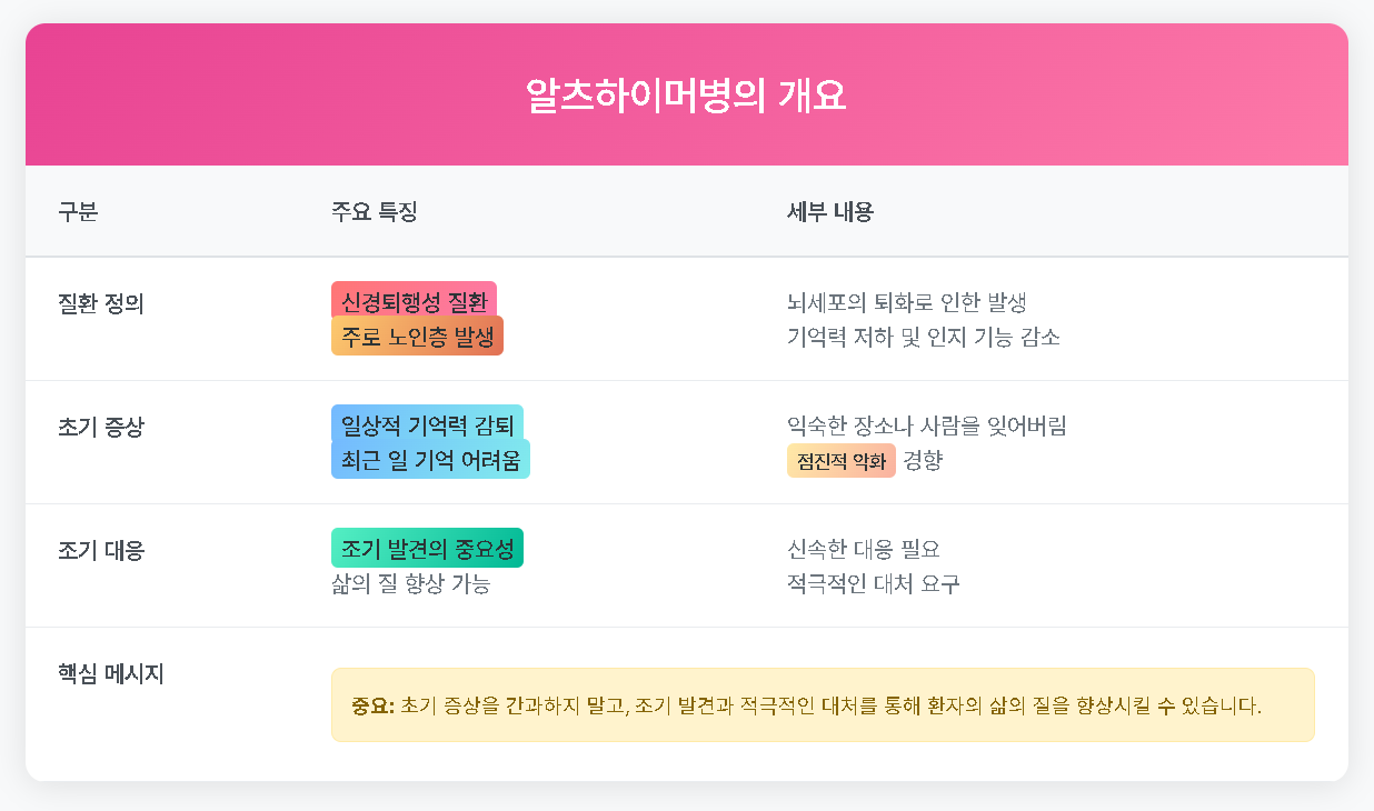 이 병은 뇌세포의 퇴화로 인해 발생하며, 초기 증상으로는 일상적인 기억력의 감퇴가 포함됩니다.