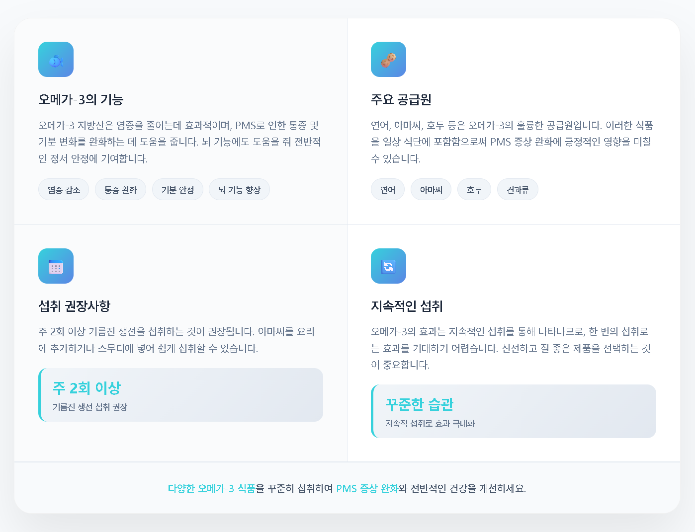 특히 아마씨, 호두, 연어와 같은 식품은 오메가-3의 공급원으로 잘 알려져 있습니다. 이러한 식품을 일상 식단에 포함함으로써, PMS 증상 완화에 긍정적인 영향을 미칠 수 있습니다. 또한, 오메가-3는 뇌 기능에도 도움을 줄 수 있어 전반적인 정서 안정에 기여합니다.