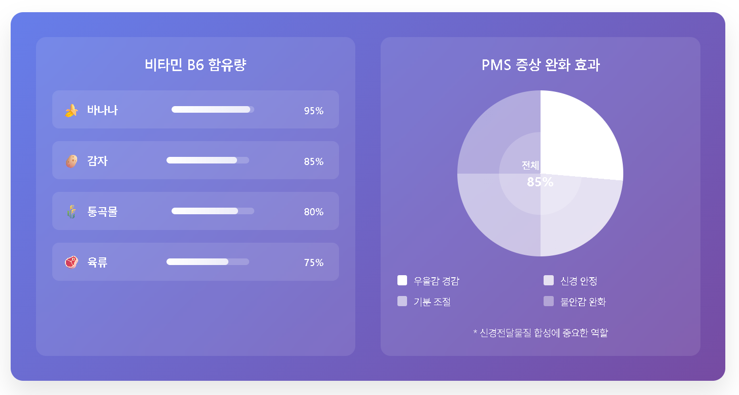비타민 B6는 신경전달물질의 합성에 중요한 역할을 하며, 기분을 조절하는 데에 기여합니다. PMS로 인한 우울감이나 불안감이 있을 때, 비타민 B6가 풍부한 식품을 섭취함으로써 증상을 경감할 수 있습니다. 바나나, 감자, 통곡물 등이 비타민 B6의 좋은 공급원입니다.