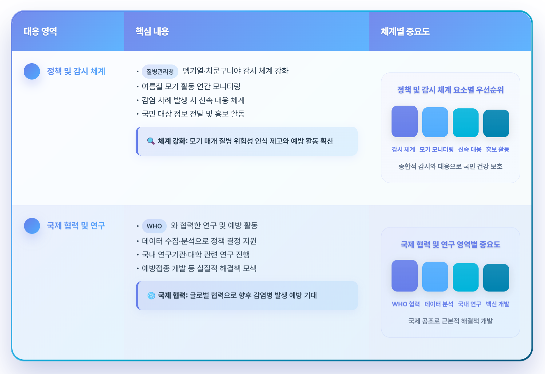 국내 보건당국은 뎅기열과 치쿤구니야와 같은 모기 매개 질병에 대한 감시 체계를 강화하고 있습니다. 질병관리청은 매년 여름철 모기 활동을 모니터링하고, 감염 사례 발생 시 신속하게 대응할 수 있는 체계를 마련하고 있습니다.