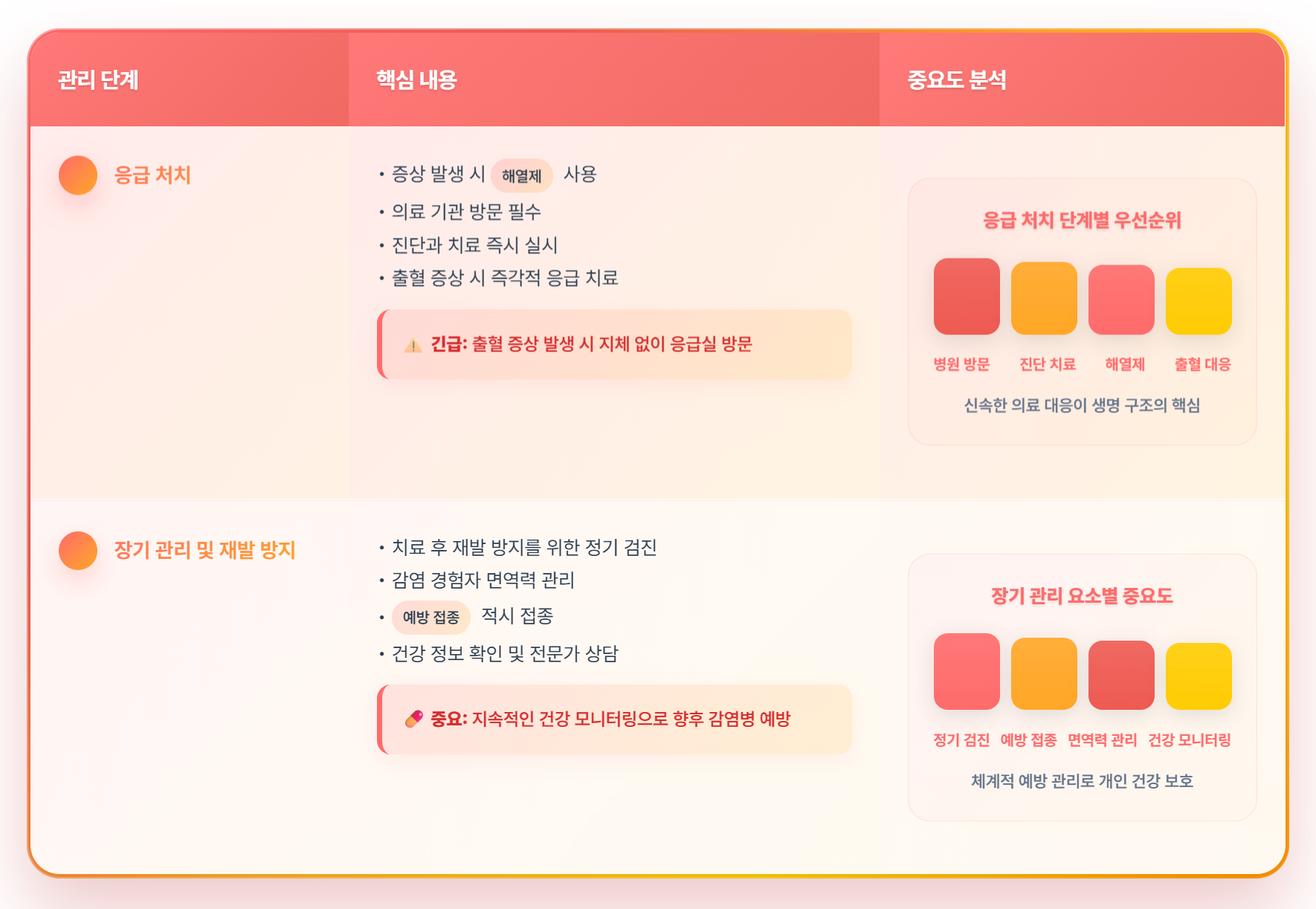 증상 발생 시 해열제를 사용하고, 충분한 수분 섭취가 필요합니다. 증상이 심할 경우 즉시 의료기관을 방문해야 합니다.