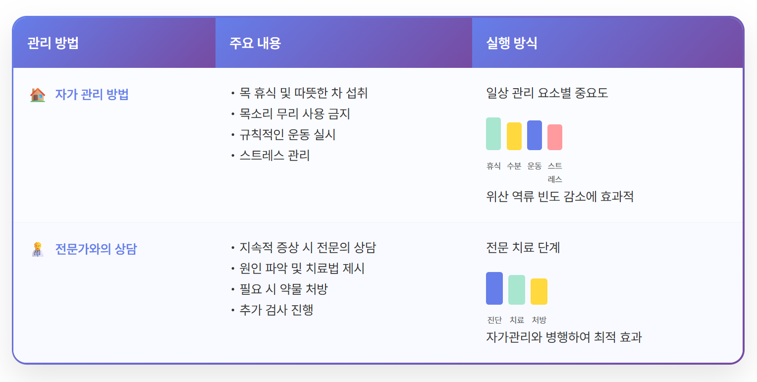 인후두 역류와 목 쉼을 관리하기 위해서는 자가 관리가 중요합니다. 목을 자주 쉬게 하고, 필요 시 따뜻한 차 등을 마시는 것이 도움이 될 수 있습니다. 또한, 목소리를 무리하게 사용하지 않도록 주의해야 하며, 필요 시 휴식을 취하는 것이 필요합니다.