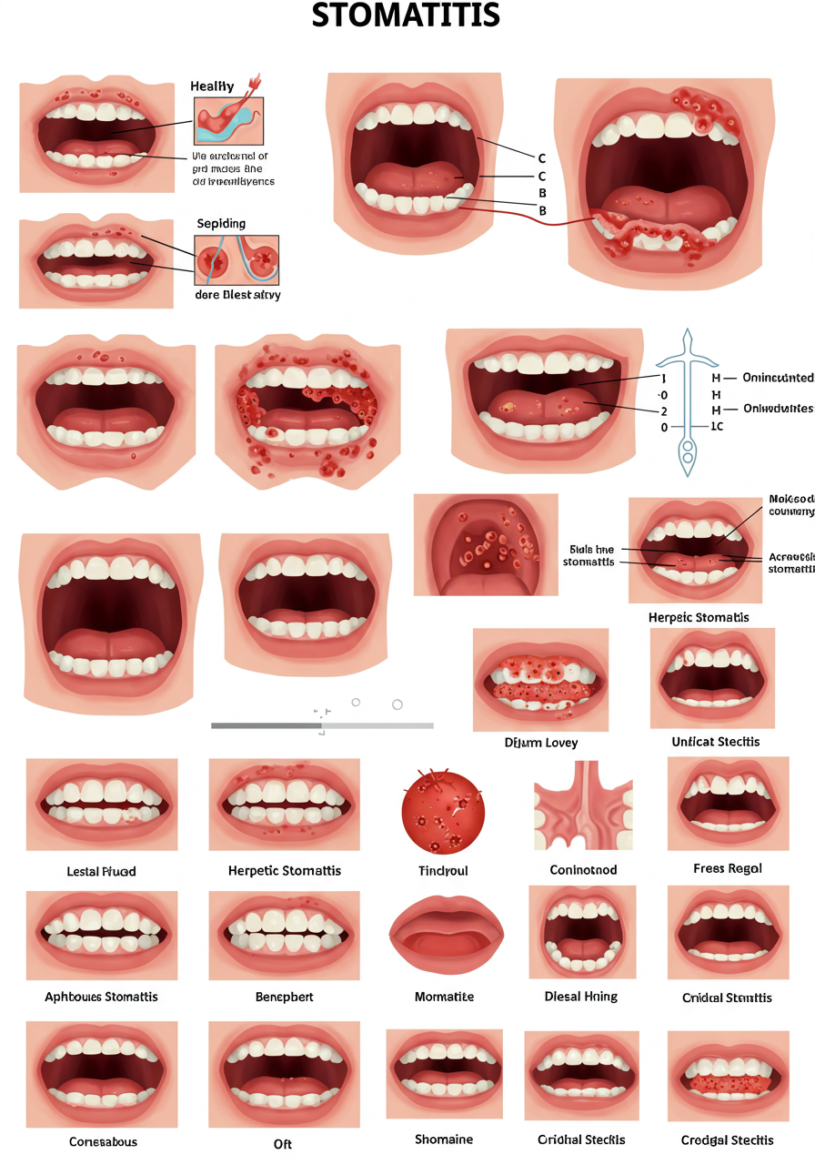 구내염은 여러 종류가 있으며, 주요 유형으로는 아프타성 구내염, 감염성 구내염, 구강 칸디다증 등이 있습니다. 아프타성 구내염은 가장 흔한 형태로, 종종 면역력 저하와 연관되어 발생합니다. 감염성 구내염은 바이러스나 세균 감염으로 인해 발생하며, 주로 어린이와 노인에게서 많이 발생합니다.