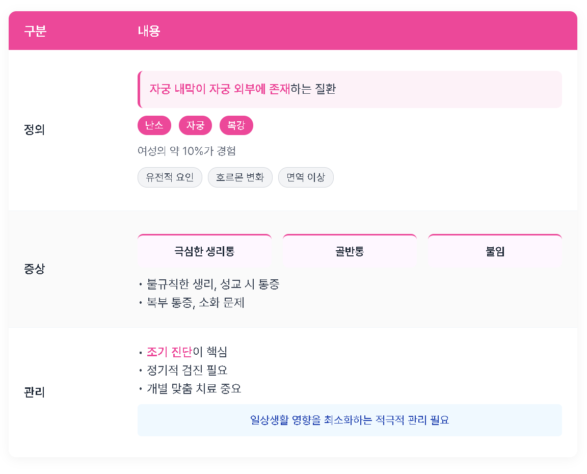 | 주요 증상 | 극심한 생리통, 골반통, 불임 등 |