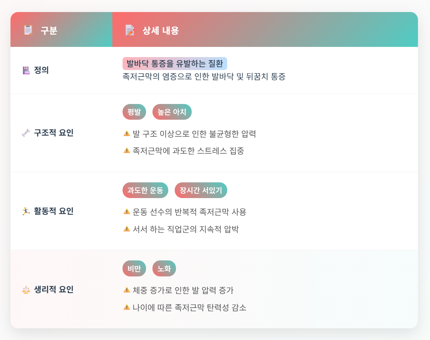 | 발바닥의 통증을 유발하는 질환 | 발의 구조적 이상, 비만, 과도한 운동 |
