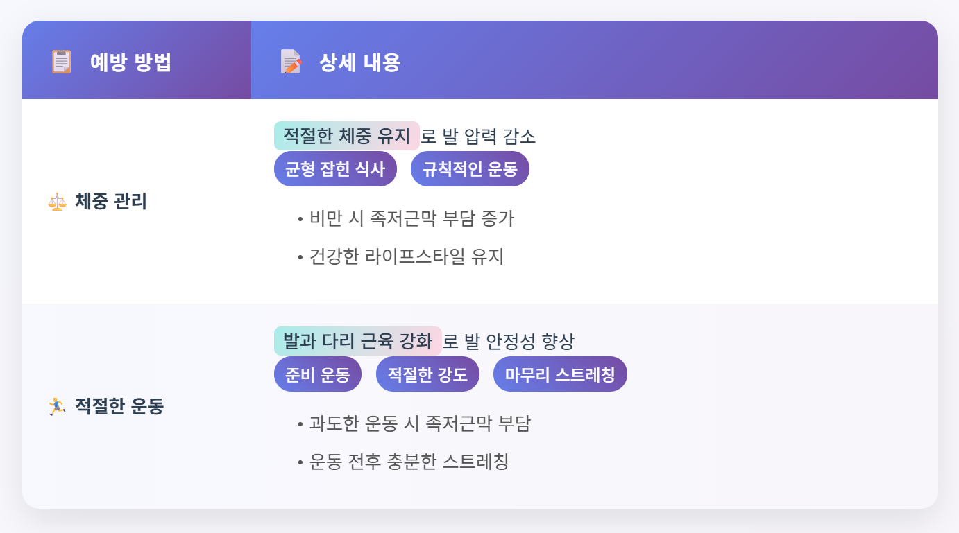 ✅예방을 위해 적절한 운동과 발에 맞는 신발 착용이 중요합니다