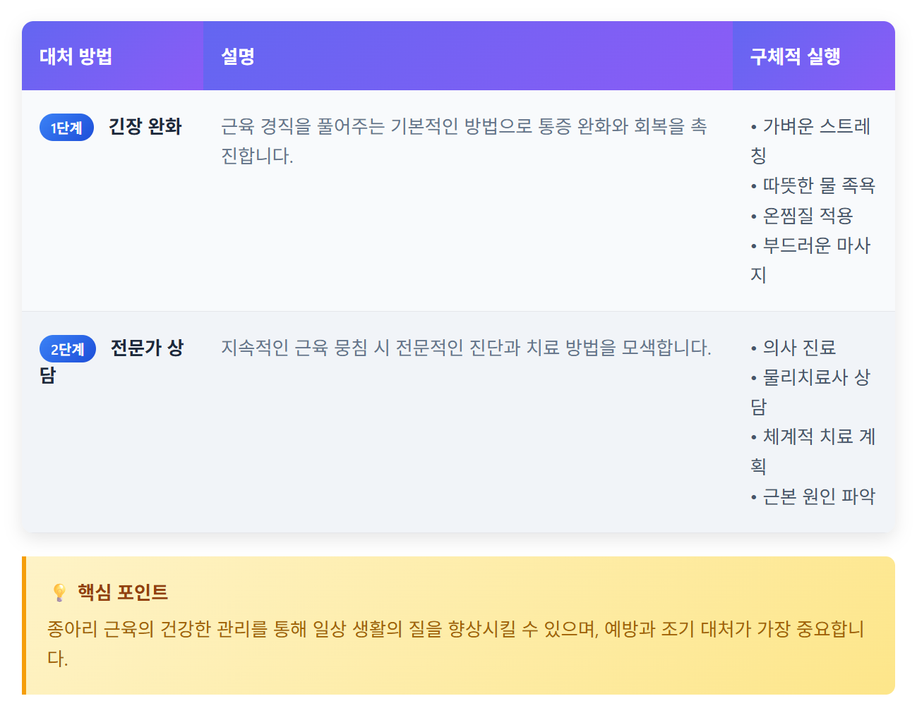 종아리 근육이 뭉쳤을 경우, 우선 긴장을 완화하는 것이 중요합니다. 가벼운 스트레칭이나 마사지로 근육을 풀 수 있습니다. 이를 통해 통증을 줄이고 회복을 촉진할 수 있습니다.