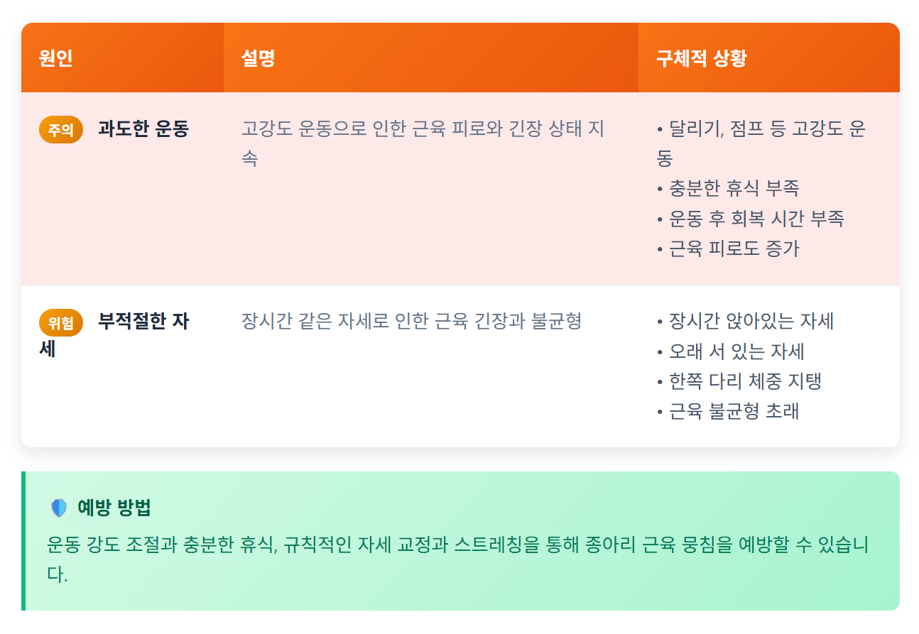 종아리 근육 뭉침의 주요 원인 중 하나는 과도한 운동입니다. 운동을 통해 근육이 과도하게 사용되면, 근육의 피로도가 증가하고 이는 뭉침으로 이어질 수 있습니다. 특히, 달리기나 점프와 같은 고강도 운동은 종아리 근육에 큰 부담을 줍니다.