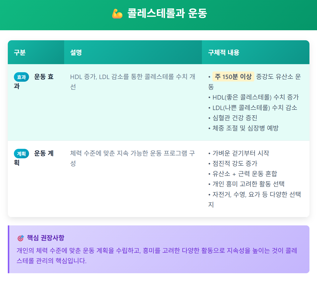 운동은 콜레스테롤 수치를 조절하는 데 중요한 역할을 합니다. 규칙적인 유산소 운동은 HDL 수치를 높이고 LDL 수치를 낮추는 데 효과적입니다. 주 150분 이상의 중강도 유산소 운동이 권장됩니다.