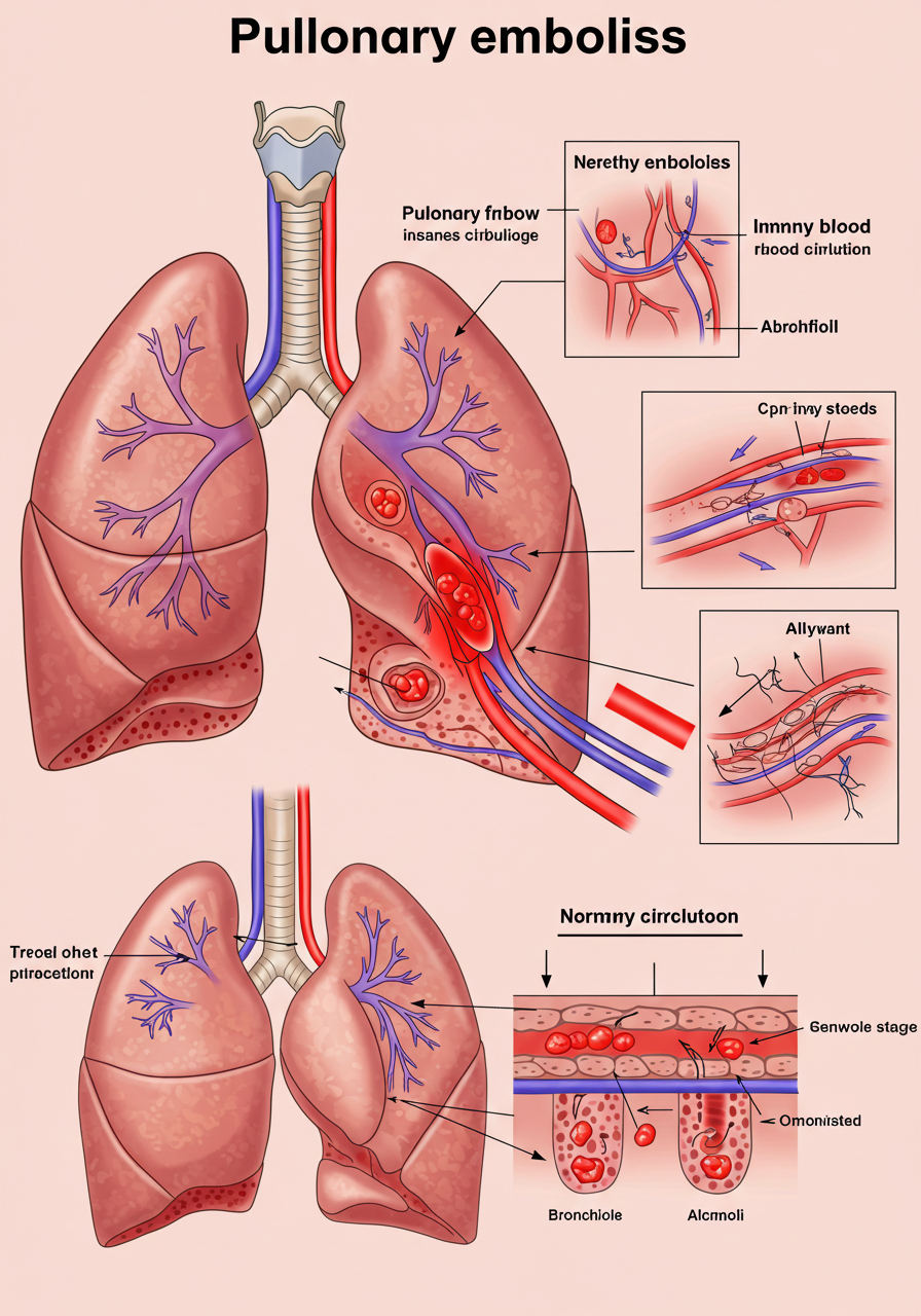 폐색전증(PE)은 혈전이 폐동맥을 차단하여 발생하는 질환입니다. 이 혈전은 주로 다리의 혈관에서 형성된 후 혈류를 통해 폐로 이동합니다. 폐동맥이 차단되면 산소 공급이 감소하여 심각한 호흡 문제를 초래할 수 있습니다. 일반적으로 심부정맥 혈전증(DVT)과 관련이 있습니다.