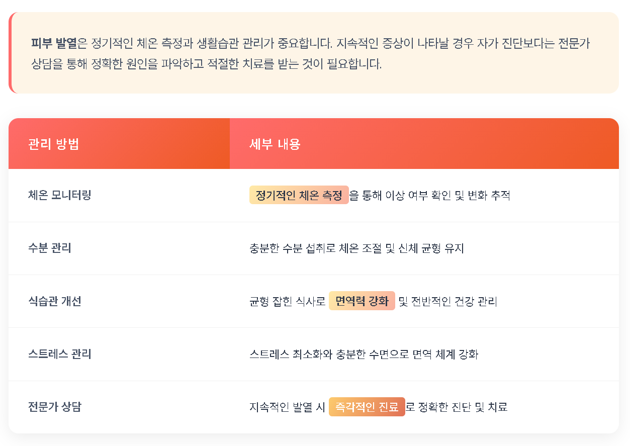 피부 발열을 관리하기 위해서는 일상 생활에서 몇 가지 주의사항을 지켜야 합니다. 우선, 체온을 정기적으로 측정하여 이상 여부를 확인하는 것이 중요합니다. 피부 발열이 지속될 경우, 즉각적으로 전문의의 진료를 받는 것이 필요합니다.